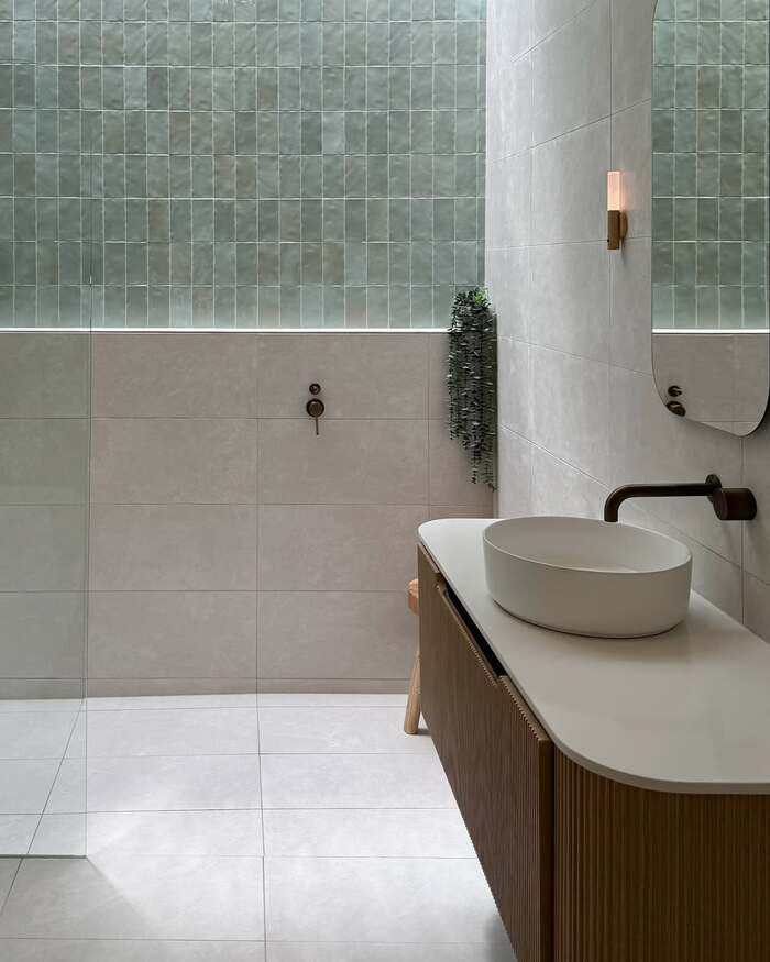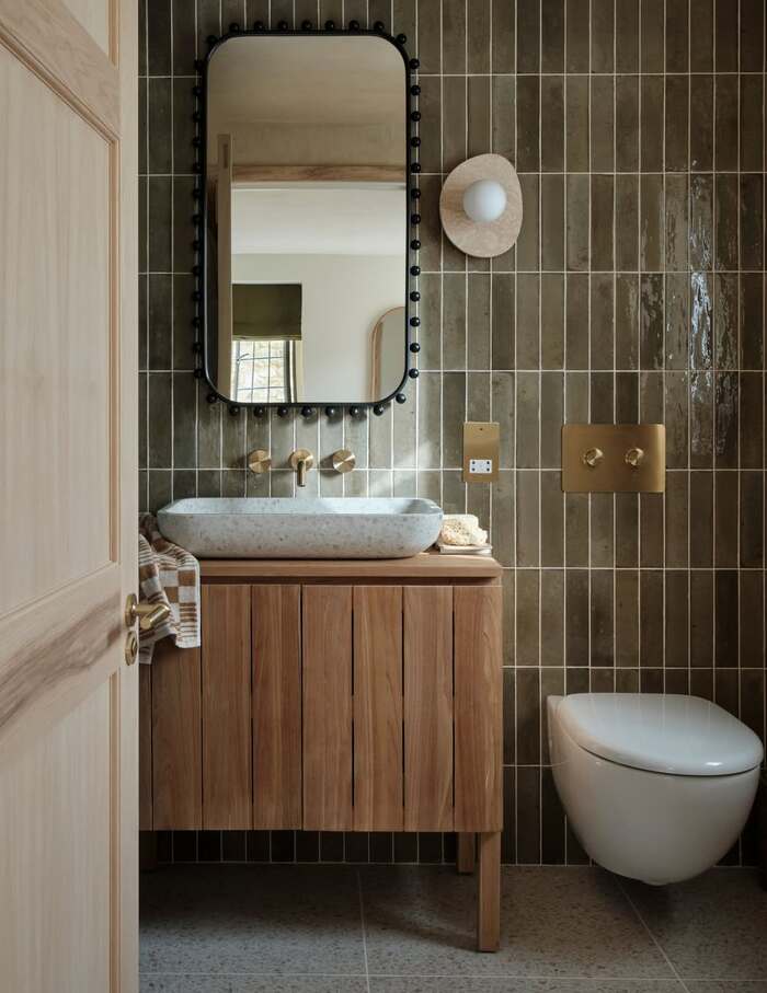 Tall skinny tiles in an earthy olive grey bring warmth to a compact room. The wood vanity and terrazzo floor pull it together. I’m telling you, vertical set always reads taller. Horizontal reads wider. If your ceiling feels low, go vertical. If you crave width, run them in a herringbone. That becomes a bathroom with gray tiles but with subtle movement.