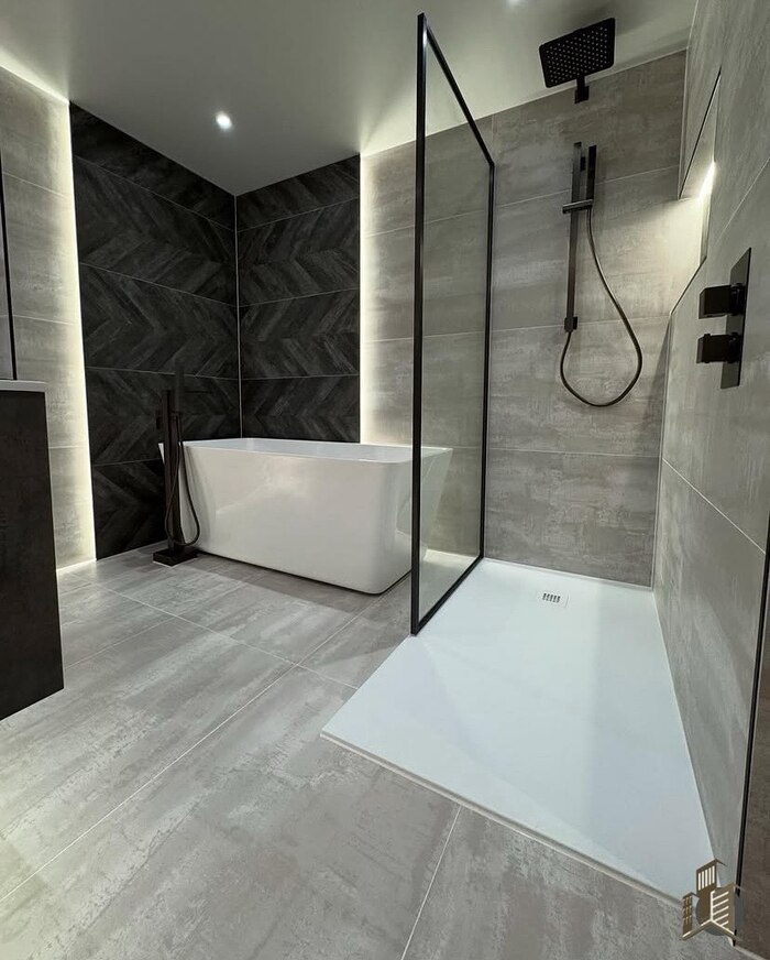 Love the moody route? Paint the ceiling the same deep tone as your wall tile. It feels like a cocoon. Add a wood niche for warmth. That’s my go-to when clients want a dark grey tile bath but still cozy.