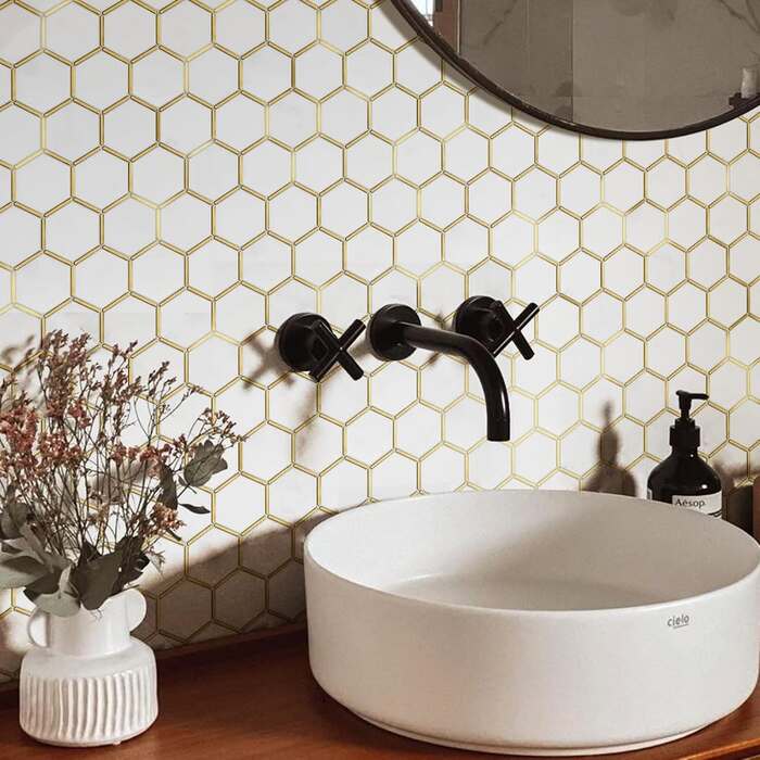 That crisp white wall with petite honeycomb and soft gold grout makes me grin. It’s glam but not noisy. Black fixtures pop like eyeliner on a clean face. Tip: use warm white, not stark white, so the metallic lines feel gentle. This look belongs in any 10+ hexagon tile bathroom checklist. Variation ideas: a hexagon tile bathrooms twist with brushed nickel or a hexagon mosaic bathroom tile border behind a mirror.