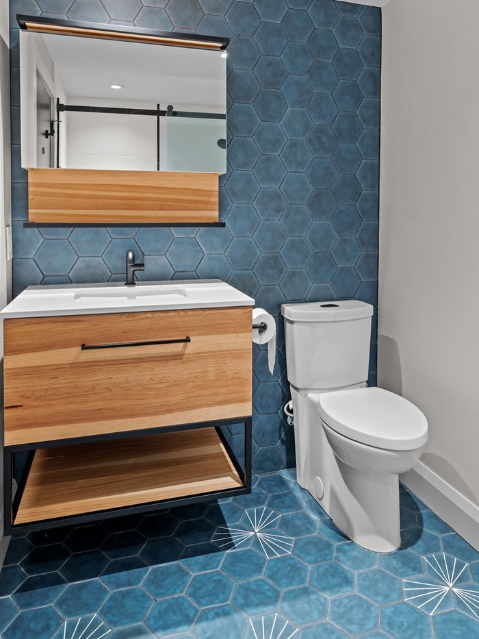 One of my favorite tricks is running blue hex up the wall and across the floor. It’s bold, yet calming. Use a slightly darker shade on the floor so the wall doesn’t feel heavy. If your space is narrow, add a floating wood vanity to warm the palette. This belongs in a 10+ hexagon tile bathroom vision board when you crave a one-color cocoon. Another variation phrase you might hear is hexagon bathroom tiles used tone on tone.