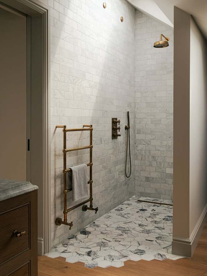 I’m very into the marble hex floor that fades into wood at the entry. It’s a moment. Use a jagged edge, not a straight line, so the two materials mingle. Seal marble often. If you cook with hair spray like me, it etches. This move belongs in a 10+ hexagon tile bathroom plan when you want luxe toes with a cozy hallway. Variation: hexagon floor tile bathroom using marble-look porcelain if budget is tight.