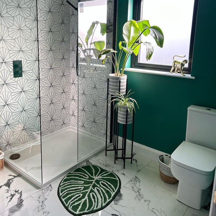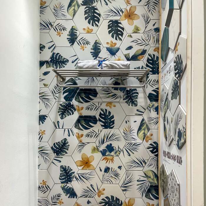 Pattern fans, you win. Botanical hex prints make a tiny shower feel like a vacation. Limit it to one wall, then grab a quiet tile for the rest so your eyes can rest. A soft brass rail warms up the cool colors. For renters, fake the look with peel-and-stick on a small panel. A hex tile bathroom can be playful and still grown up.