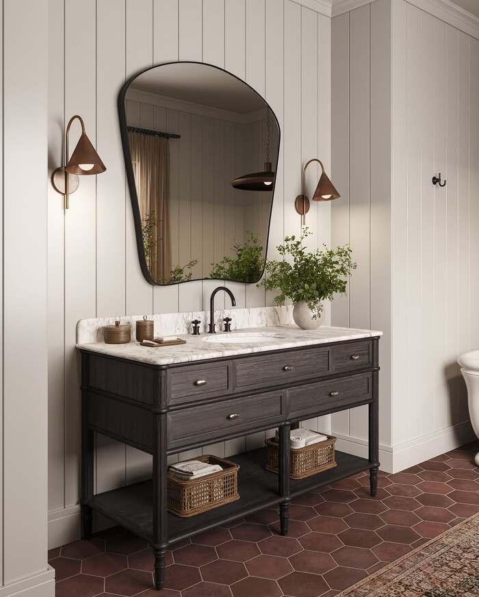 I swear terracotta smells like sunshine. Those earthy hex floors under a vintage vanity are romantic and strong. Pair with creamy walls and dark bronze taps. Don’t polish too high or it goes slippery. This vibe is peak honeycomb tile bathroom. Also a smart choice for hex tiles in the bathroom when you want warmth without wood.