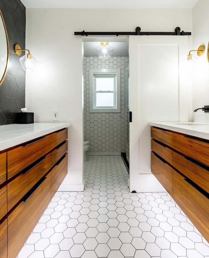 White hex floors running from vanity area into the toilet nook feel clean and connected. Use a light gray grout so it doesn’t look dirty after three showers. I like big mirrors and globe sconces here. If you’re planning a 10+ hexagon tile bathroom, this is the baseline style to compare everything else to. It proves simple is never boring. Another variation term to note: hexagon tiled bathroom with continuous flooring.