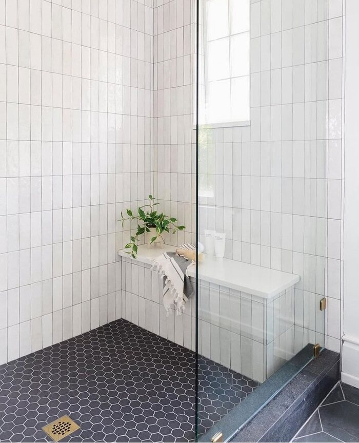 Dark penny would be expected. But matte charcoal hex on the floor with skinny vertical wall tile looks sharper. Add a little plant for life. The slope of the pan reads better with smaller hex sizes, so stick to 1 or 2 inch pieces. This is a practical hexagon bathroom tile move since the extra grout lines boost slip resistance.