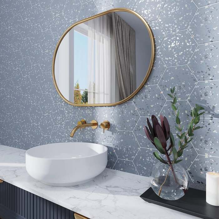 The speckled blue hex backsplash behind a modern vanity feels like jewelry. I’d keep counters super simple and let the wall sparkle. A brushed brass spout is perfect, not too shiny. If you’re chasing a 10+ hexagon tile bathroom that photographs like a magazine, try this. A similar variation is a hexagonal tile bathroom done in muted sage with champagne fixtures.