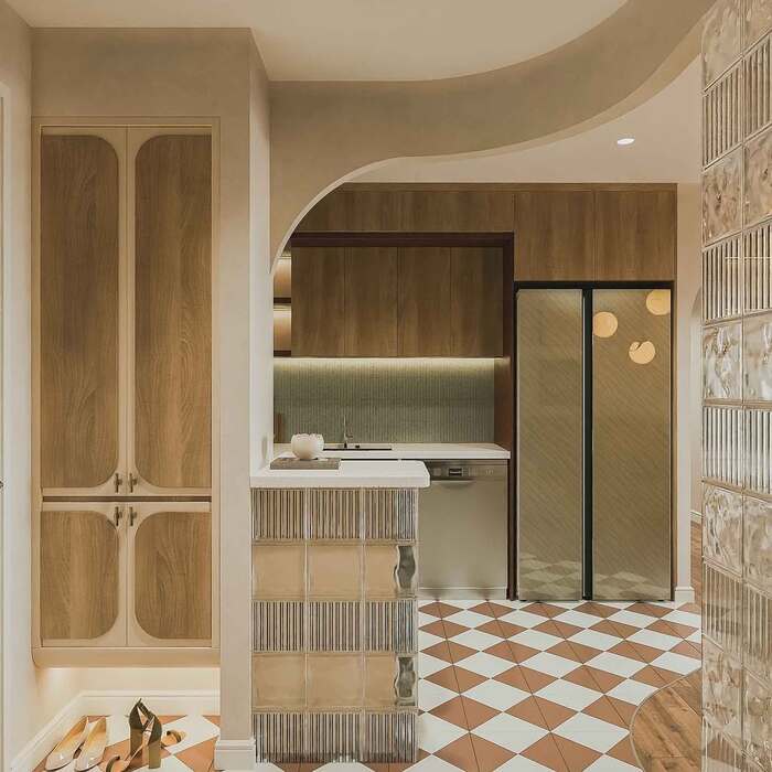 That soft arch opening into the kitchen feels friendly, like it waves hello. The burnt terracotta and cream checkerboard kitchen tile floor is playful but still calm. Tip from many remodels: if your cabinets are warm wood, pick a tile with a little contrast and let the grout match the lighter tone. It keeps the pattern crisp. Variation idea if you’re nervous about big pattern on a tiled kitchen floor, rotate the squares at 45 degrees and do a tighter border so the rhythm feels softer.