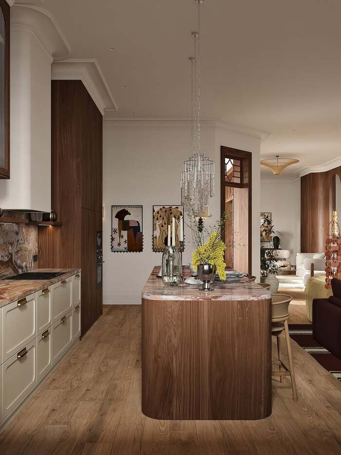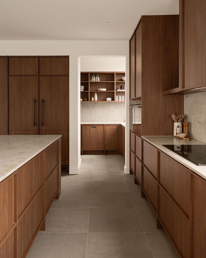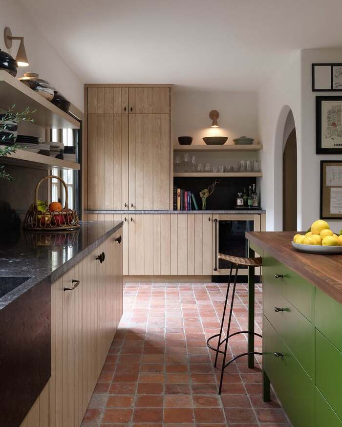 The waterfall island with rounded corners looks expensive because it is, but you can mimic the vibe. Pair rich wood with a large format kitchen tile floor in taupe or mushroom. Fewer grout lines equals calmer energy. I’m team rectified edges here. It makes the slabby stone counters feel grounded. Add thin baseboards and let the tiles run tight to the cabinet toe kicks for a custom look.