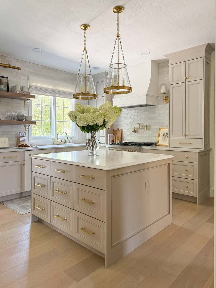 This one is a quiet stunner. The island is the hero, but imagine sliding in a soft gray kitchen tile floor with a satin finish. You get reflection without glare. I used to swear by glossy tile until I cleaned spaghetti sauce at midnight. Now I vote matte for real life. For a kitchen floor tiles scheme like this, choose a warm gray grout to tie the brass and stone together.