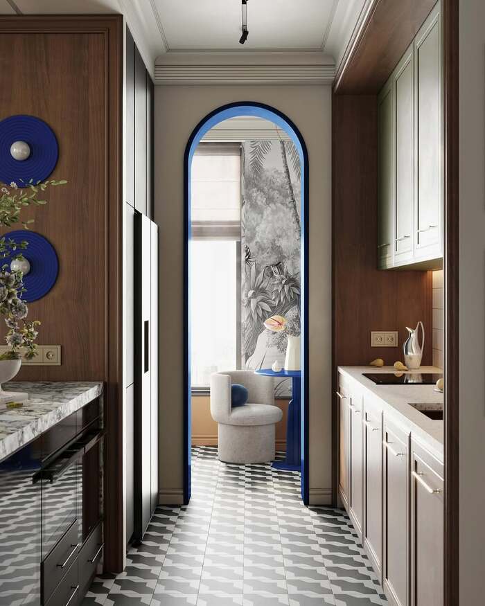 In the long galley kitchen, the geometric kitchen tile floors keep your eyes moving straight to the bright window. Love that trick. Linear patterns stretch a narrow room. Here’s my hack. Use a cooler palette underfoot and keep appliances paneled so the tile does the guiding. A patterned kitchen tile floor reads like a runner rug you never trip on. For budget, try ceramic instead of porcelain on walls and save porcelain for the tile kitchen floor since it handles traffic better.