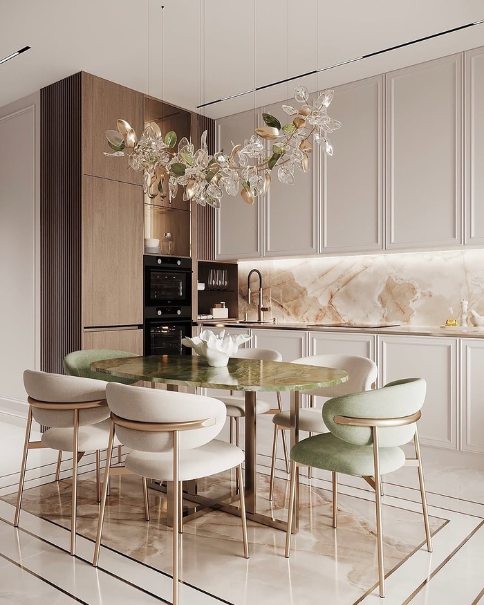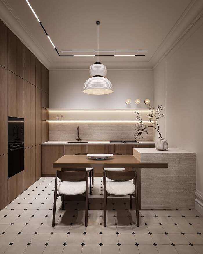 Luxurious but not cold. If you want glam, try a polished porcelain kitchen tile floor with a faint vein to mirror your stone. Keep furniture soft and rounded so the gleam doesn’t feel icy. Use a matching base tile as a low splash behind the trash area. It’s a tiny builder trick that saves paint touchups.