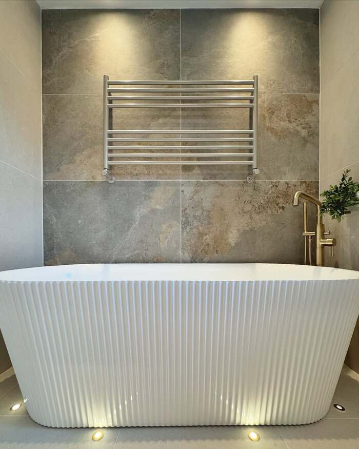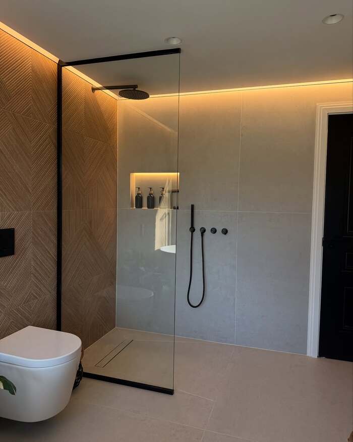 Mix one wall of fluted porcelain with large flat tiles on the rest. The texture catches morning light like stripes. Keep it to one wall so it doesn’t turn busy. Pair with a frameless panel and you’ve got big-format shower tile ideas that feel custom.