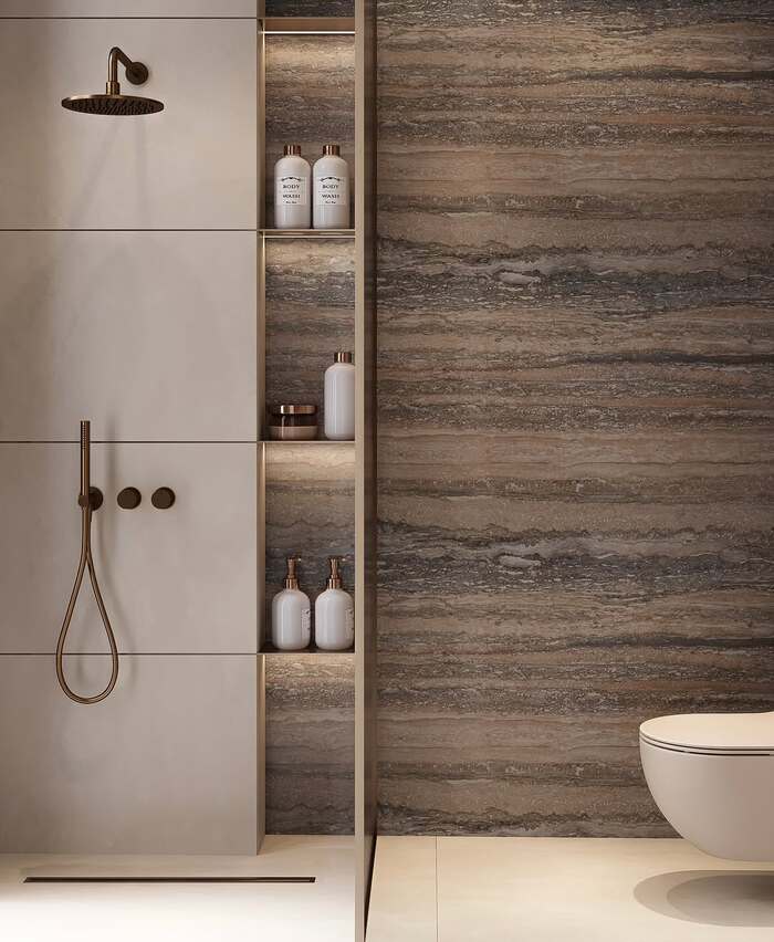 Oversized porcelain slabs give you the drama of stone without fussy upkeep. Fewer grout lines means less scrubbing and a seamless large tile shower look. Line up the veining from wall to wall like a puzzle. I once skipped that step and the walls argued with each other. Patience wins.