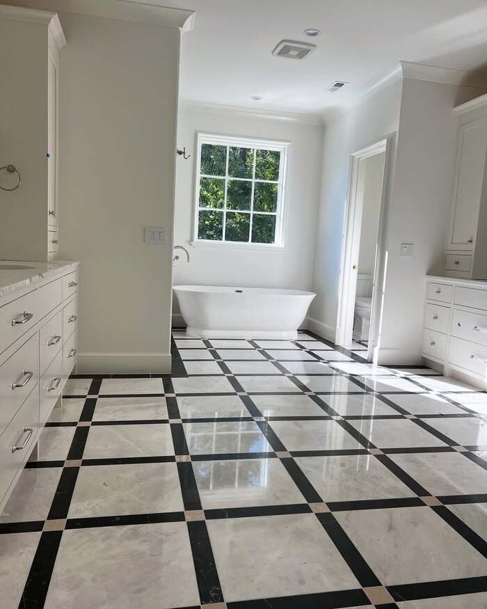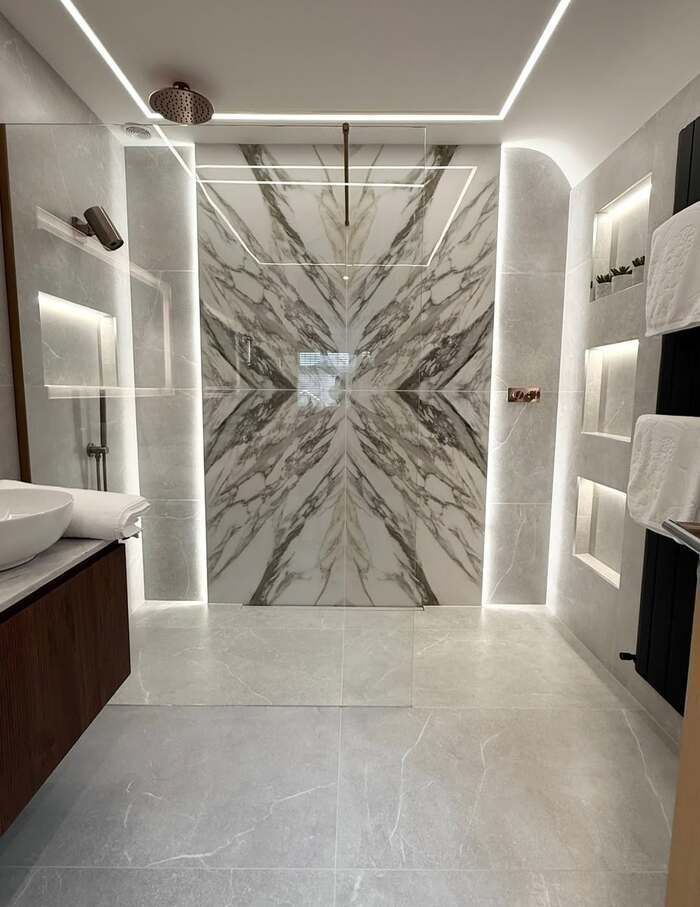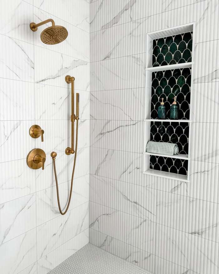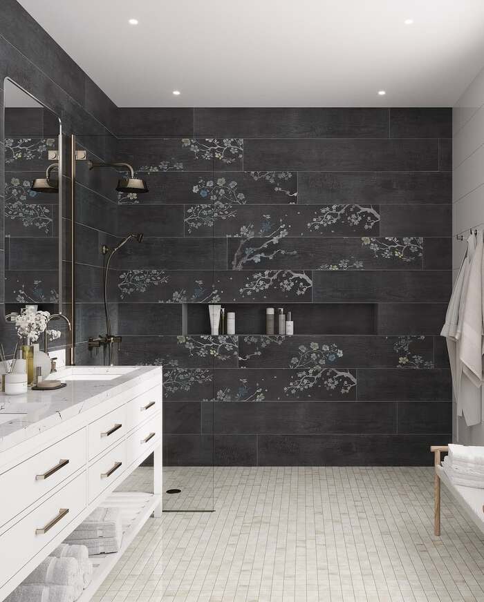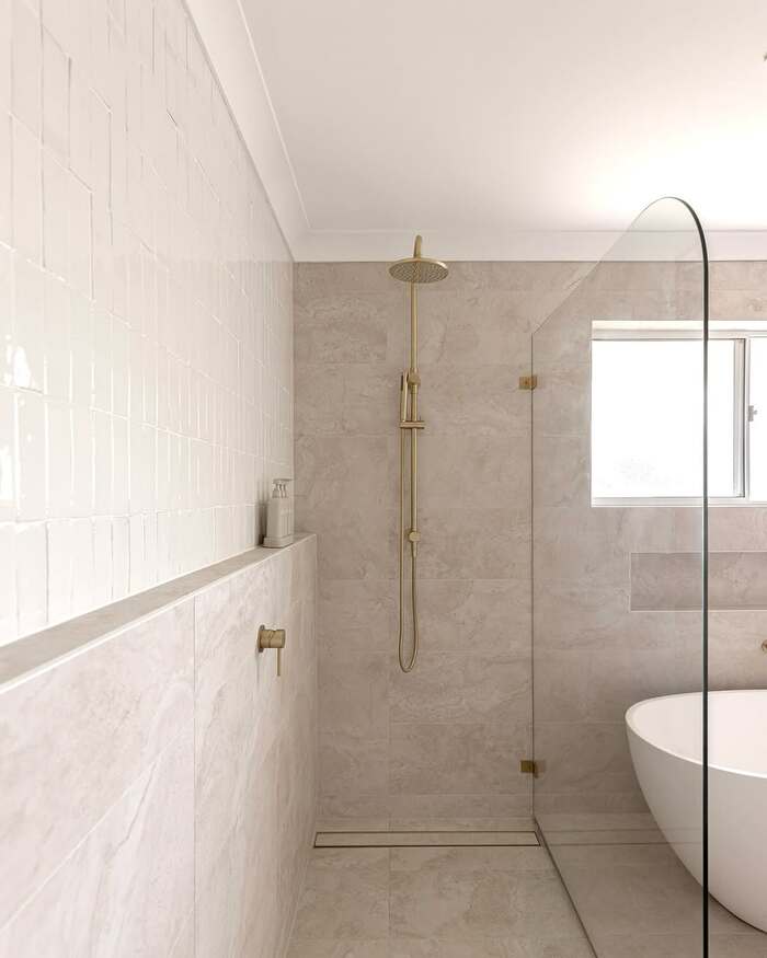 Use the same tile size in two colors. Dark on the bottom third, light on top. The line should hit just below eye level. This makes a large tile shower feel taller and more designed. It also hides splash marks where water loves to play.