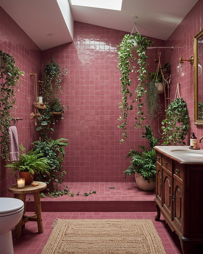 The moody raspberry squares are glossy and a little wobbly, which I love. Real clay variation makes a pink tiled bathroom feel grown up, not babyish. Tip from my toolkit: repeat the tile on the floor for a cocoon effect, then soften it with tons of plants. Brass or aged bronze hardware warms up pink bathroom tiles so the space reads cozy, not cold. Out of all my 10+ pink tile bathroom ideas, this one photographs like a movie set.