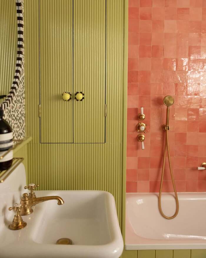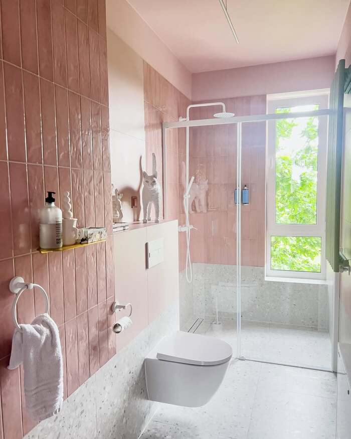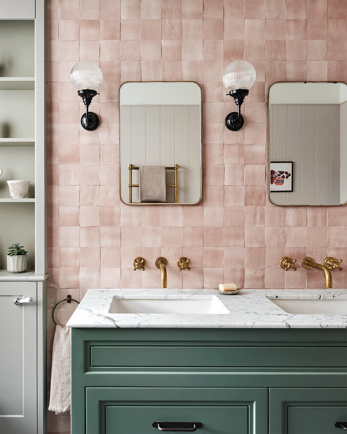 Matte clay tiles feel like velvet. Pairing them with a deep green vanity gives that Paris apartment mood. Use warm globes and brass taps. Keep the mirror shape simple. If you’re testing a pink tile bathroom idea in an older house, try this one first. It respects the bones.