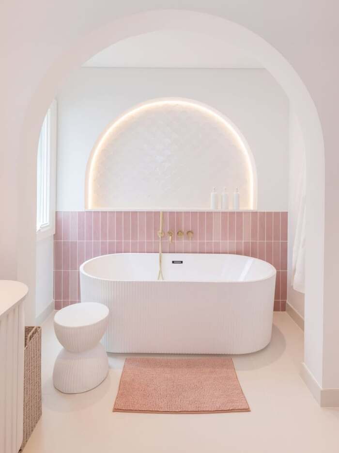Half height verticals are money. You get color and still keep clean white plaster above. I learned the hard way that a full pink wall can bounce onto your face in the mirror and make makeup tricky. With this blush tile bathroom idea, the lighting stays flattering and romantic. Use rounded edges on the arch so it’s soft, not sharp.