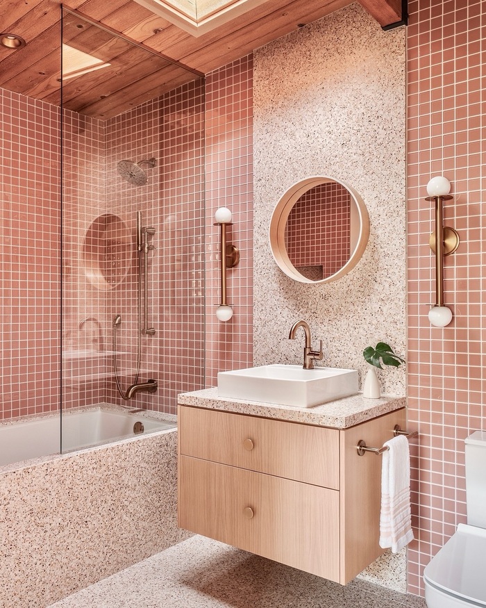 That tiny pink grid with the terrazzo tub platform is adorable and also smart. Small tiles bend around edges for cleaner lines, so your pink tiled bathroom looks custom without a custom bill. Use warm brass for contrast, matte not mirror. Pro tip. Choose a sand colored grout that matches terrazzo flecks so the pink bathroom tiles shine but don’t scream. If you want hotel vibes, add a round mirror and keep the vanity floating.