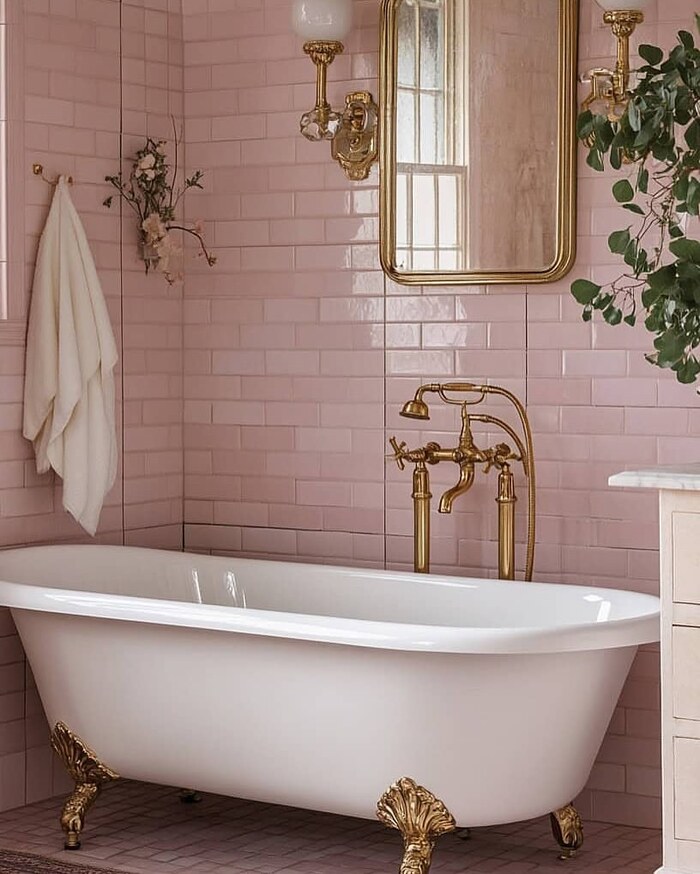 A clawfoot tub, blush subway tile, and grand little feet in antique brass. I can’t pretend I’m not a sucker for this. If your home has trim and character, this rose tile bathroom belongs. Layer linen curtains, add a tiny sconce, and frame one piece of art with soft browns. Keep the pink bathroom tiles matte so the brass feels warmer.