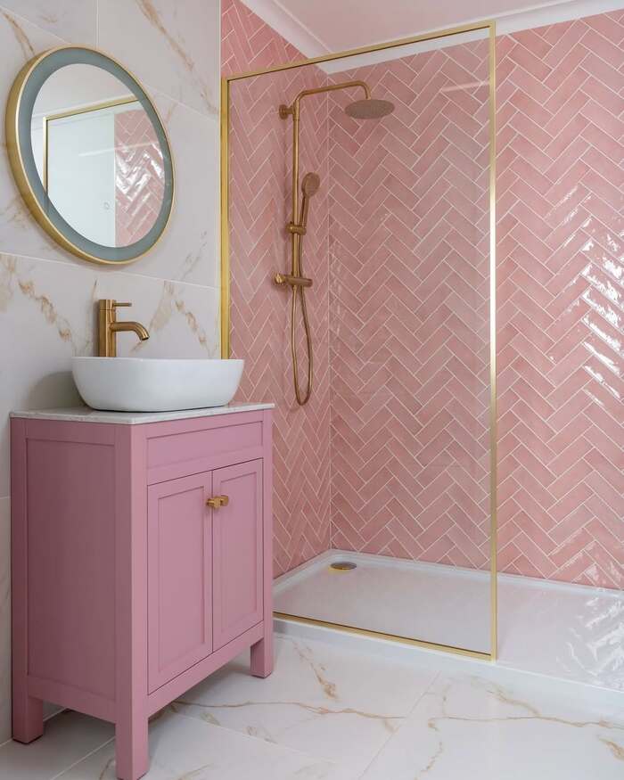 The glossy herringbone wall is high glam, but the brass trim keeps it grounded. For a tile bathroom in pink, herringbone gives motion and makes ceilings feel taller. I confess I once installed bright white grout here and regretted it after the first shampoo drip. Go soft beige grout instead. Pair with a petite vanity in a deeper rose so the pink shower tile reads layered, not flat.