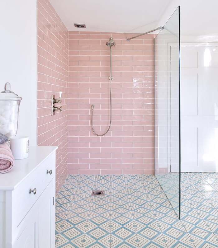 This is the happy bath. Pink subway on the walls, geometric blue on the floor, and everything feels like a summer day. When you combine patterns, hold one as the hero. Let the floor be loud and let the pink bathroom tile go smooth and even. Keep hardware polished nickel so the palette stays cool. Add a tiny stool for soap and your selfies will behave.