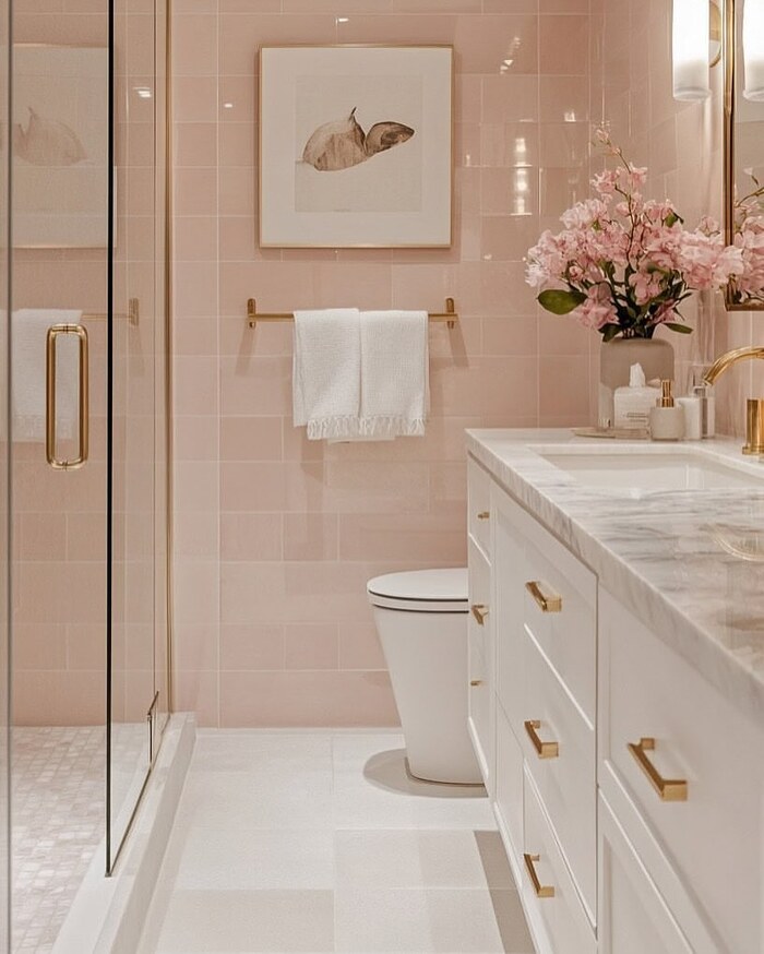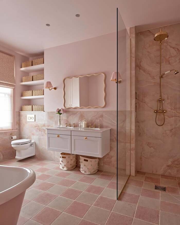 Warm checkerboard squares on the floor and polished stone in the shower bring old Hollywood energy. If you like classic styling, this is your blush tile bathroom. I’d use a long shower niche and repeat the stone on its back panel. That trick looks spendy, promise. Keep walls a pale shell color and let the millennial pink bathroom tile handle the romance.