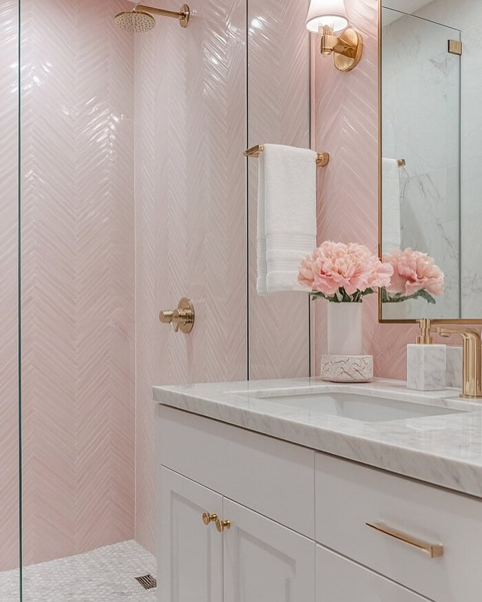 Chevron looks luxe and still friendly. The pattern is subtle, but your brain reads movement. I like this for small rooms because it stretches the wall height. Choose pearl grout and a white marble vanity. If you want more storage, tuck a shallow cabinet over the toilet and paint the interior a dusty rose. Secret color moments make a pink tile bathrooms plan feel thoughtful.