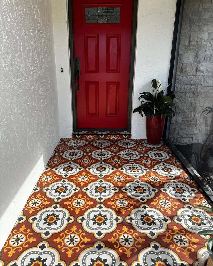 The bold red door and that spicy patterned floor scream confidence. This porch gives your guests a smile before the hello. I’d balance it with a simple black mat and one glossy planter. Too many colors will shout over the pattern. Seal the porch tiles twice the first year, since sun hits hard near a doorway. This one belongs squarely in my 10+ porch tile notes.