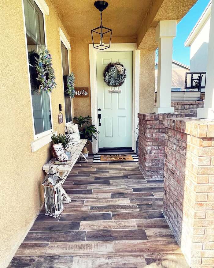 If your heart wants wood but your climate says nope, porcelain planks save the dream. Stagger lengths and mix three tones for a believable story. A matte finish hides dust better, and a grout close to the mid-tone looks clean longer. This warm, neighborly porch tile idea is perfect for farmhouse or craftsman. Closing out my 10+ porch tile dreams with a hug.
