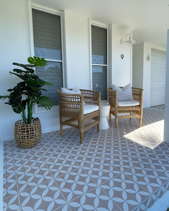 Soft tan with white petal shapes feels calm, beachy, and super clean. Rattan chairs make it breathe. If your home runs warm whites, this porch tile flooring slides in perfect. I’d choose a bone grout, not bright white, so the joints don’t glare. Keep furniture legs capped to protect the surface. Such a gentle entry, and yes, part of the 10+ porch tile set I’m saving.