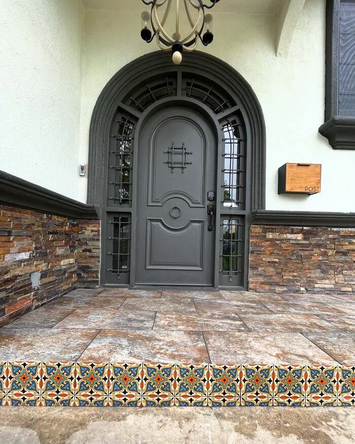 You know that tiny step that always looks meh. Dress it with a decorative border. This porch pairs rugged stone on top with colorful front porch tile on the risers and it’s chef’s kiss. It’s a small move that reads custom. Tape off edges and pre-cut every piece before thinset so your pattern stays level. This detail belongs in the 10+ porch tile list because it’s small money, big drama.