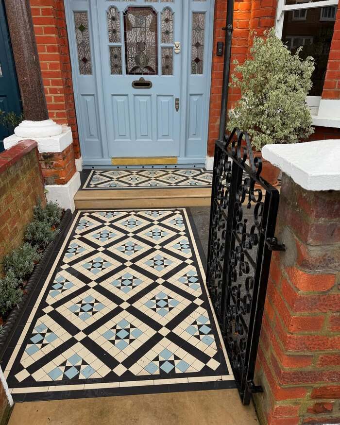 This crisp grid with star accents is a total classic. Pairs beautifully with a pale blue door. If your house is brick, that cool-warm pull looks fancy without trying. I suggest a charcoal grout so mud doesn’t show. Dry lay the whole porch tile pattern first. Trust me, moving one diamond later hurts feelings. Another 10+ porch tile favorite.