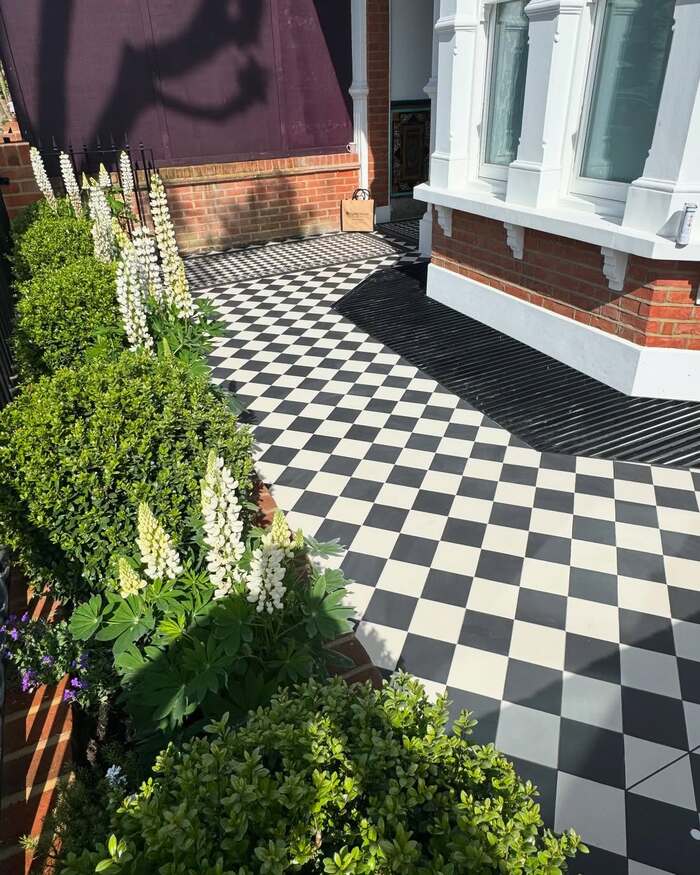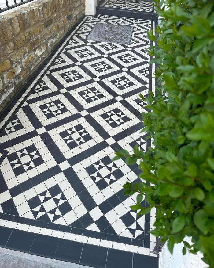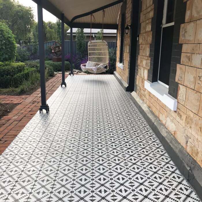 Graphic, sharp, a little bit rock and roll. I’d pair it with soft beige walls so the contrast doesn’t punch too hard. Keep accessories simple. A hanging chair, one big plant, done. When you grout, float diagonally across the triangles so the tips don’t chip. This porch tile makeover makes even a narrow corridor feel styled.