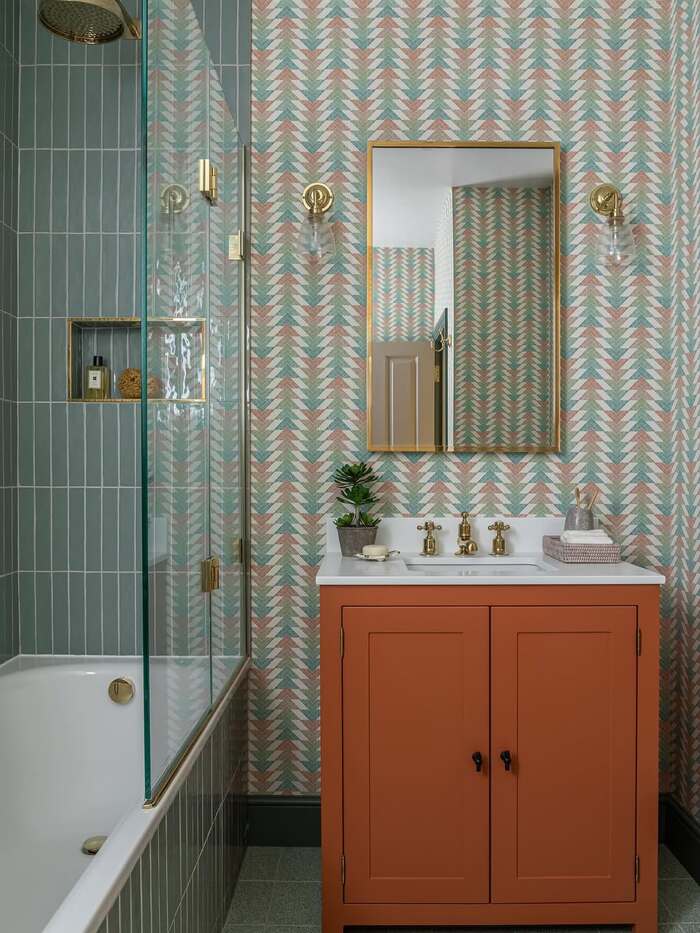 The tall green-gray stack in the tub-shower combo is elegant, and the patterned wall next to it feels like a fun cousin at the party. Why it works. The shower tiles are quiet, the wallpaper talks, and brass trim keeps peace. If you copy this, use matte shower wall tile inside the splash zone and seal the wallpaper with a clear varnish outside the glass line. That gives you style without soggy corners.