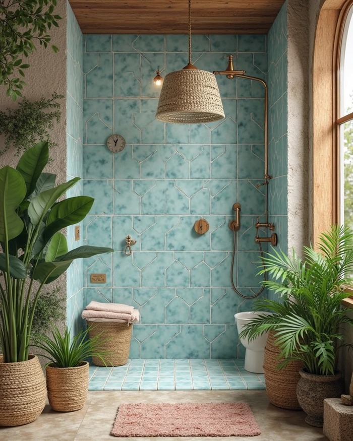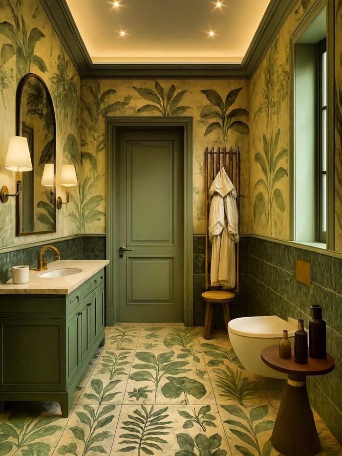 That garden bathroom is wild in the best way. Leaf print floor tiles meet deep green wall cladding. If you try a nature print, repeat the green tone somewhere else so it feels intentional. Tile for a shower that is near wallpaper or murals should be satin or matte to avoid glare. Add a hidden linear drain so the big pattern stays unbroken.