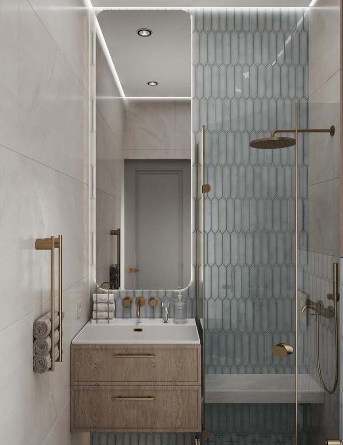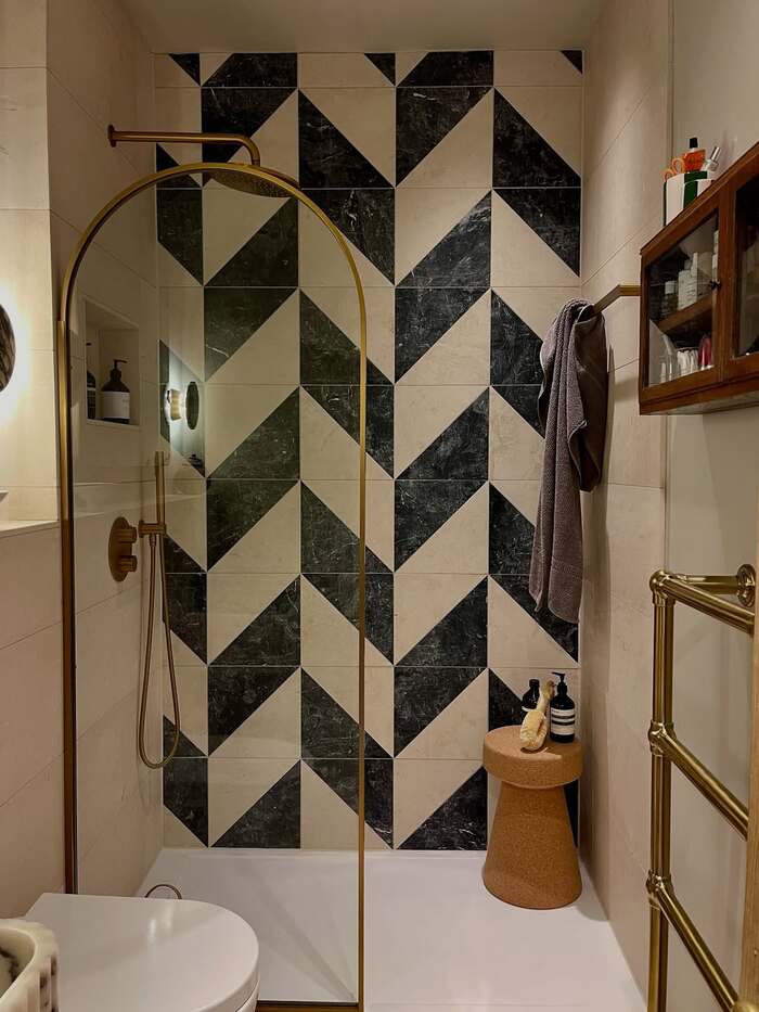 This geometric wall is a showstopper. The pattern pulls you forward and makes the ceiling feel higher. For modern shower tile ideas like this, keep the floor simple and the fixtures warm metal. My tip. Use a leveling clip system during install so the large tiles sit flat. Otherwise those diagonal lines will rat you out.