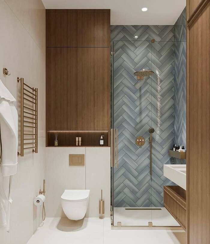 I’m a fan of herringbone because it brings motion without shouting. These cool blue ceramic planks set in a tight V look like ripples. Pair them with walnut cabinetry for warmth and choose almond grout so the pattern reads soft. If you want bathroom shower tile that does easy mornings, this is it.