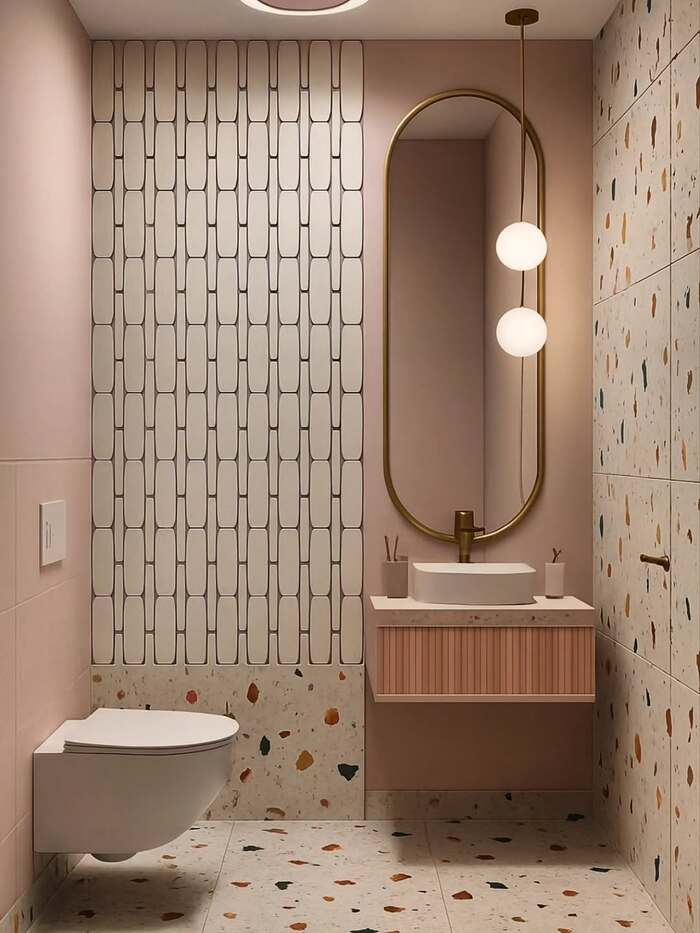 Terrazzo, blush walls, and a ribbed vanity