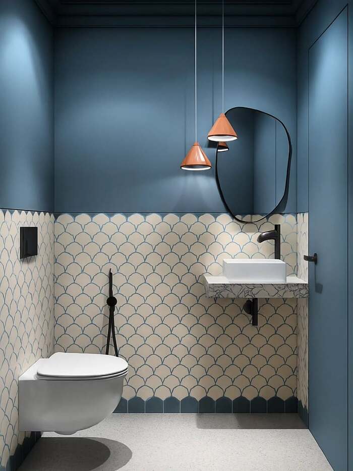 • Fish scales with deep navy paint and matte black fixtures for contrast.