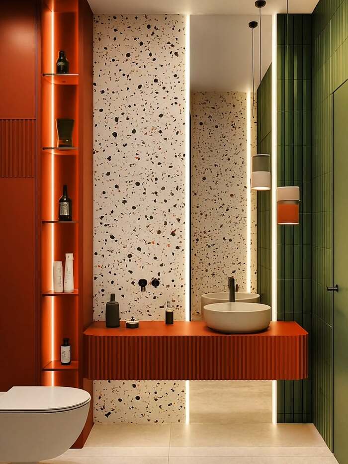 This one screams boutique hotel, except you can live with it. Use the terrazzo slab as the mirror wall and simple vertical strips in the shower. Lighting is the secret. Warm LED strips tucked into reveals bounce softly off the terrazzo and make even a tiny tiled shower feel special.