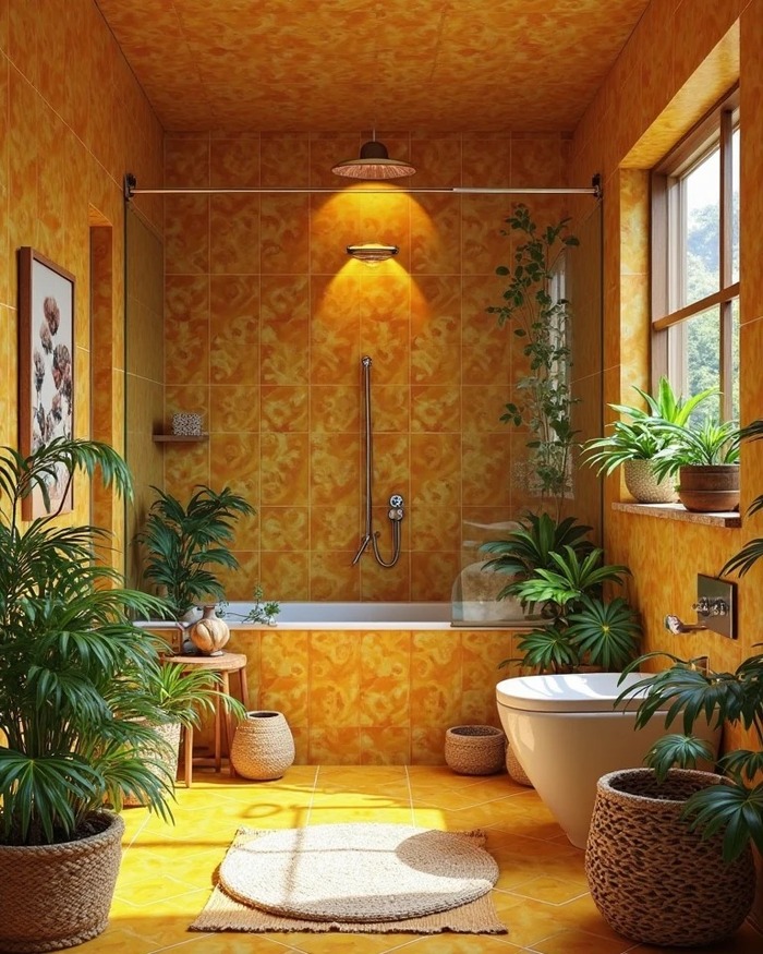 Yes, orange. The whole room wrapped in marbled citrus tiles is joyful, like vacation mornings. If you want this vibe, choose a slightly cloudy glaze so the walls do not feel flat. Tie in natural baskets, rattan, and plants to cool the heat. For the floor, a small mosaic bathroom shower tile will add grip without interrupting that sunny color.