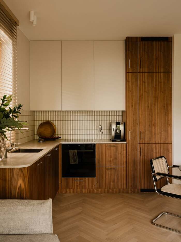 That slim, pencil-like tile against warm walnut cabinets is quietly dreamy. I like vertical stack bond here because it stretches the wall height. Use a soft off-white or oatmeal grout to keep it cozy. Trick I swear by: match grout to the cabinet tone, not the tile, for a subtle fade. This setup screams modern subway-tile kitchen without trying too hard. Add a micro-ledge under the uppers for spices. Another pin in my 10+ subway tile kitchen board.