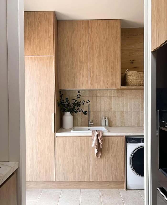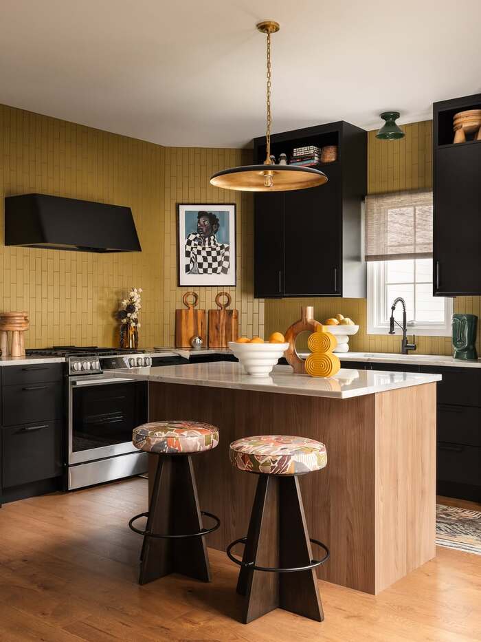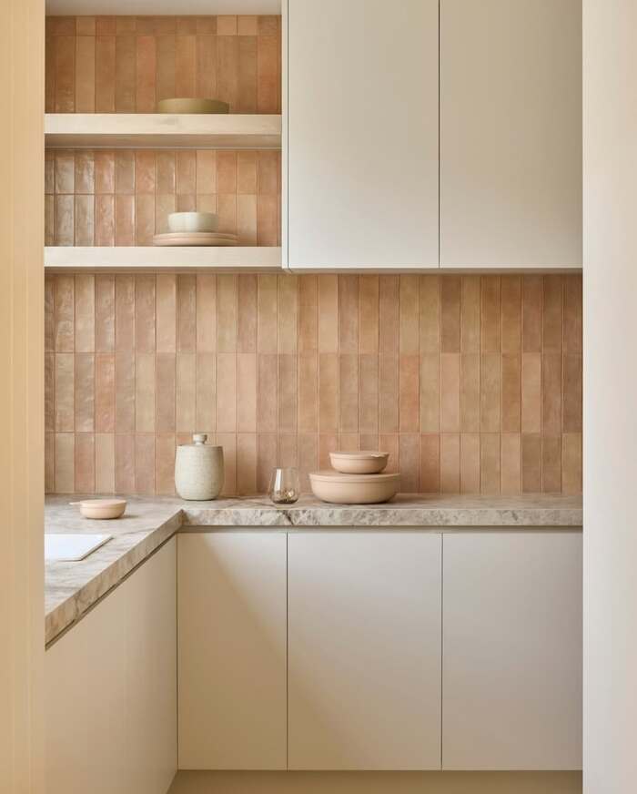 Terracotta-peach tiles, set tall, flood the room with warmth. Pair with stone that has a little pink in the veining so it sings. If you fear color but you’re bored, this is your gateway colored subway tile kitchen moment. Keep the cabinet doors plain and let the glaze variations do the talking.