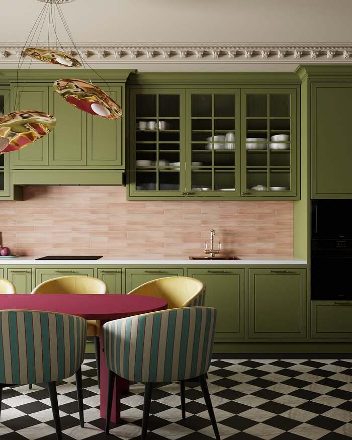 Green millwork with a blush horizontal field is basically a rom-com meet-cute, and I’m not even sorry. The gentle, rosy kitchen with subway tile warms the green so it doesn’t feel strict. Run the tiles in a classic running bond, then keep outlets aligned to grout lines so you don’t ruin the rhythm. A matte brass tap completes this colorful subway tile kitchens moment, totally worthy of any 10+ subway tile kitchen roundup.