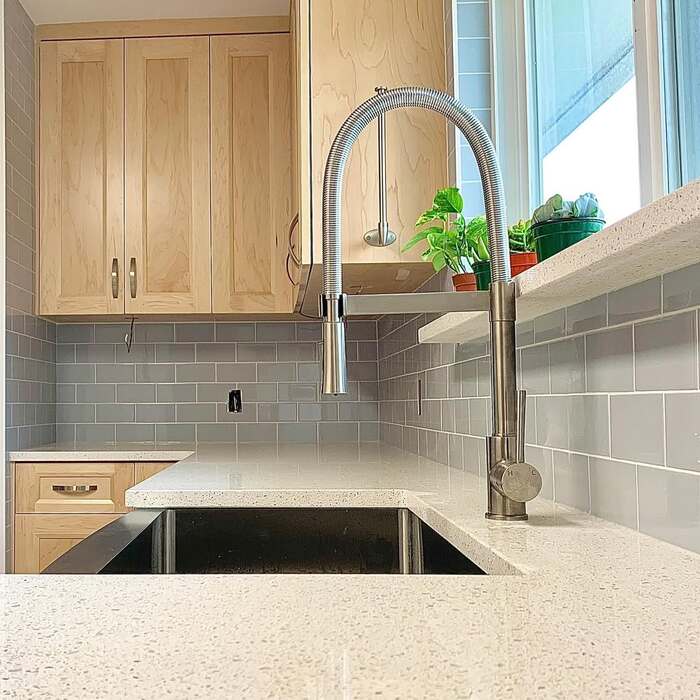 Soft gray glass tiles feel spa-calm in a work zone. They reflect daylight and make stainless pop. For installs, I back-butter glass to avoid trowel lines showing through. A thin white grout line makes this modern subway tile kitchen crisp. If you’ve got lots of maple or birch cabinets, this cool tone balances the honey nicely.