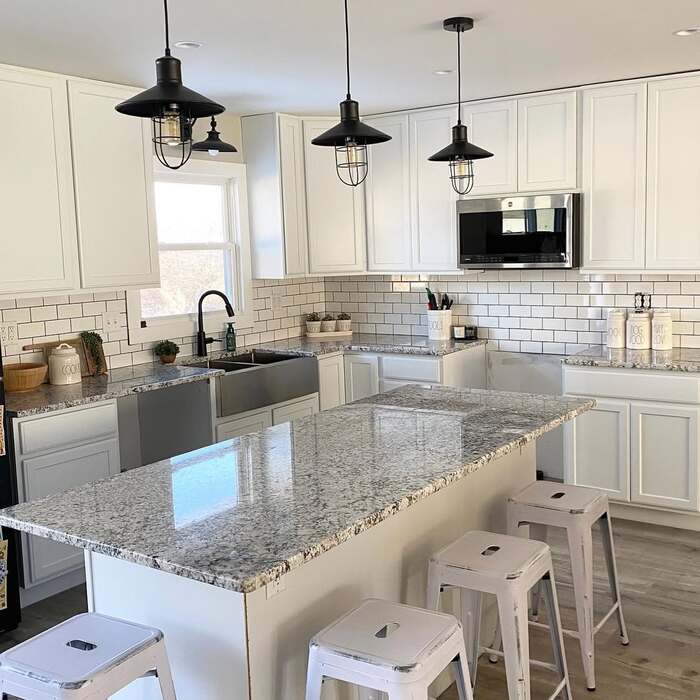 Classic white subways with soft gray grout, chunky apron sink, black hardware. It’s comfort food for kitchens. My tip: finish with a bullnose trim at the window return so it feels custom. This white subway tile kitchen is the set-it-and-forget-it option, which is why it sits high in my 10+ subway tile kitchen picks.