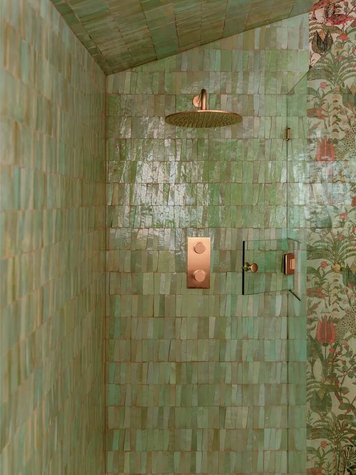 This jade box is my soft spot. The uneven handmade tiles catch light like water, so even on Monday mornings it feels calm. Pro tip from many installs: use a slightly darker grout so cleaning is easier. If you copy this tile shower idea, warm metals like brass make the green glow. It’s classic tile shower inspiration for small bathrooms because the shimmer fakes depth.
