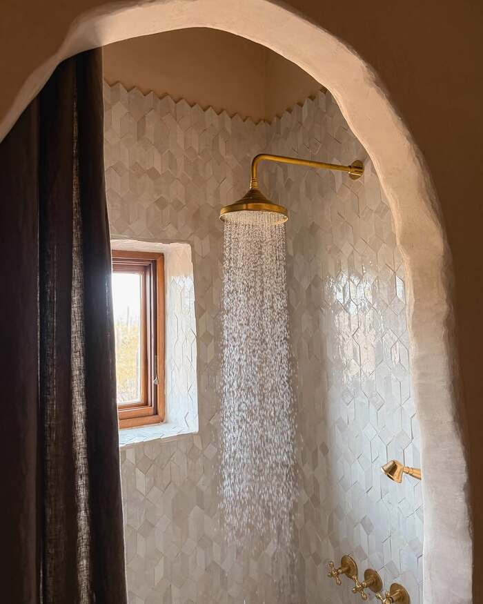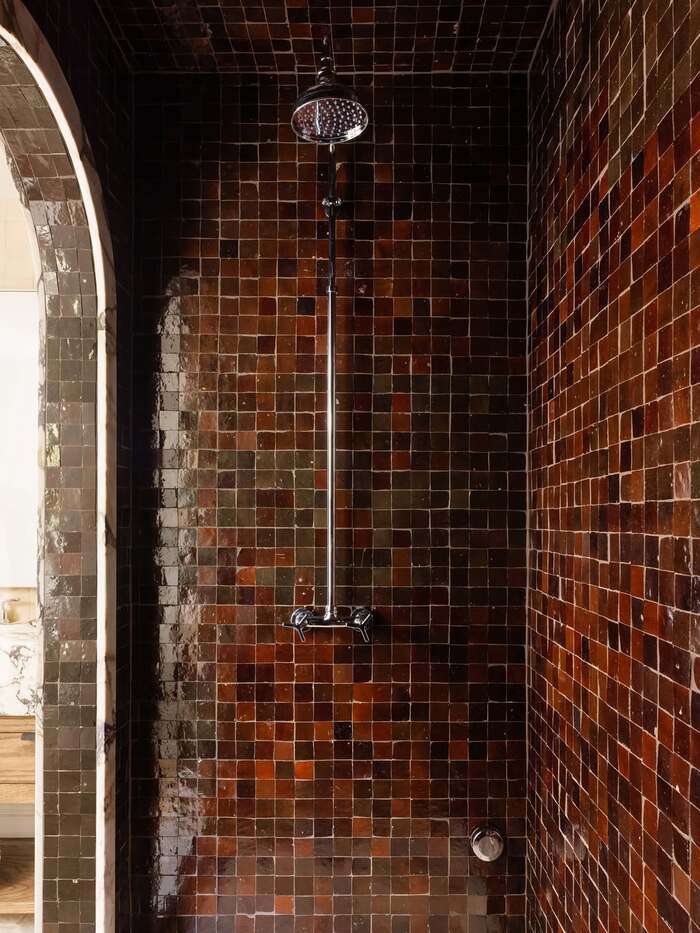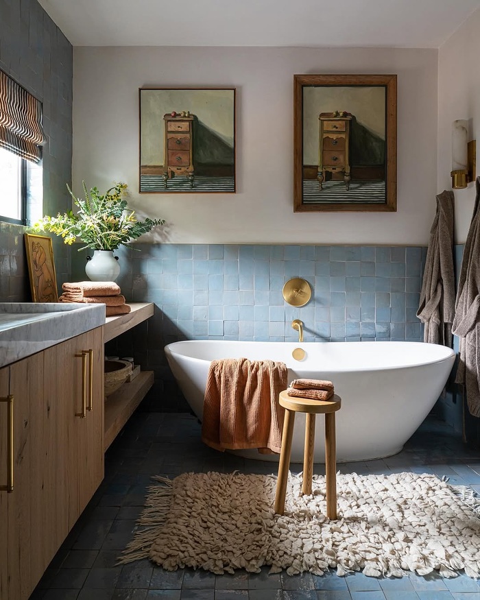 Blue zellige plus brass is a cheat code. It reads vintage but not fussy. The half-height wainscot of tile also saves money. Leave the upper wall for framed art or a soft plaster finish. This is one of those 10+ tile shower ideas that works in rentals too because you can retile just the lower half later if needed.