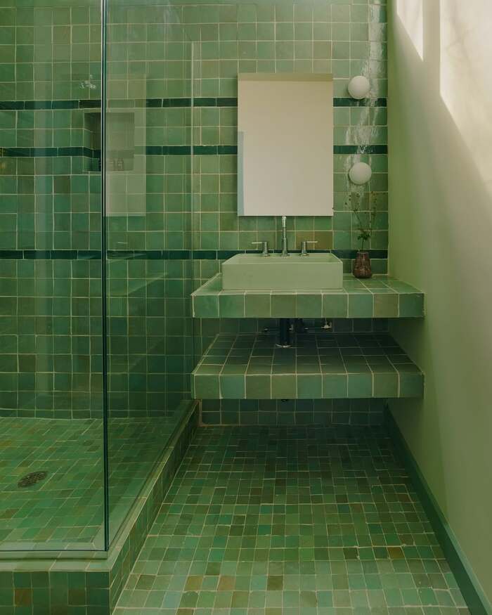 When the vanity, floor, and walls share the same jade tone, the room reads like a cozy greenhouse. I love the simple band detail running around the shower. It ties everything together without screaming. If you want tile ideas for showers that feel custom, continue the tile to shape shelves or even a floating sink. Choose a linear drain so cuts stay neat.