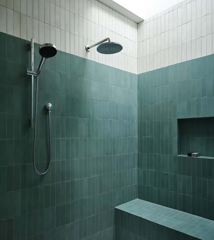 Stacking tile vertically makes ceilings feel taller. Going dark on the bottom and pale up top keeps the room grounded. I recommend a mid-tone grout so the lines don’t look like notebook paper. If your shower has a bench, wrap it in the same dark tile so it disappears. Clients ask for simple shower tiling ideas and this is my go-to.